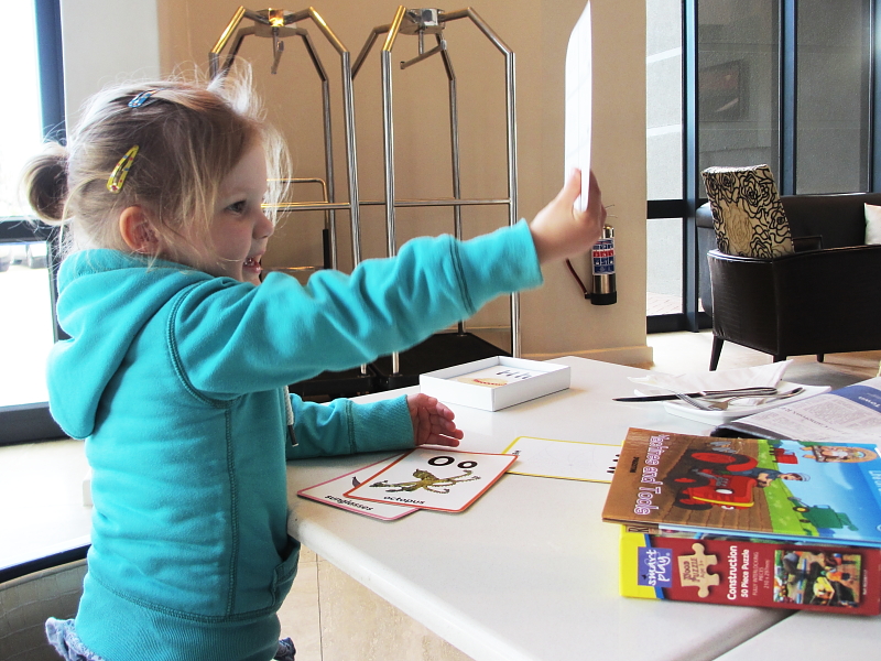 Grace and I took Keren out to lunch at Cin Cin for her birthday. While we were waiting for our food Grace was playing teacher teacher with Keren – 2 weeks at school and already playing school :). Grace would hold up one of her alphabet cards, show it to Keren and say "say gift" or whatever else happened to be on the card. If Keren said the wrong word Grace would repeat it until she said it correctly.